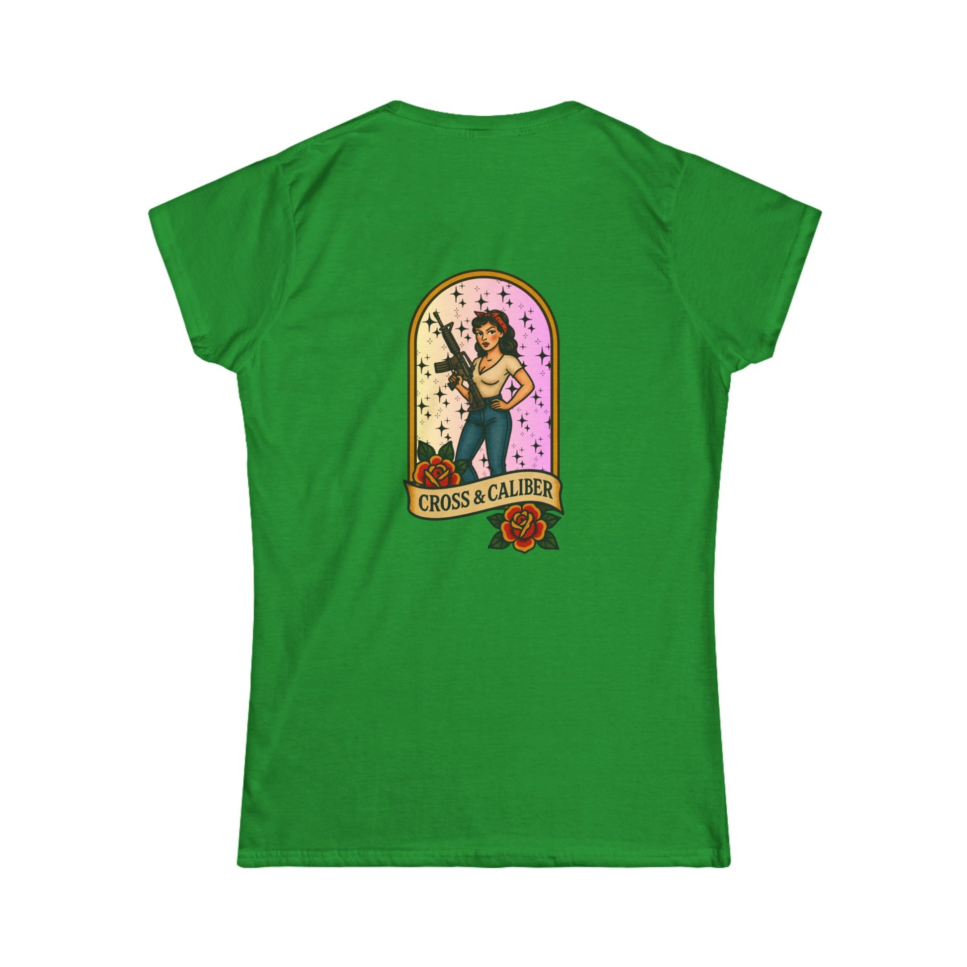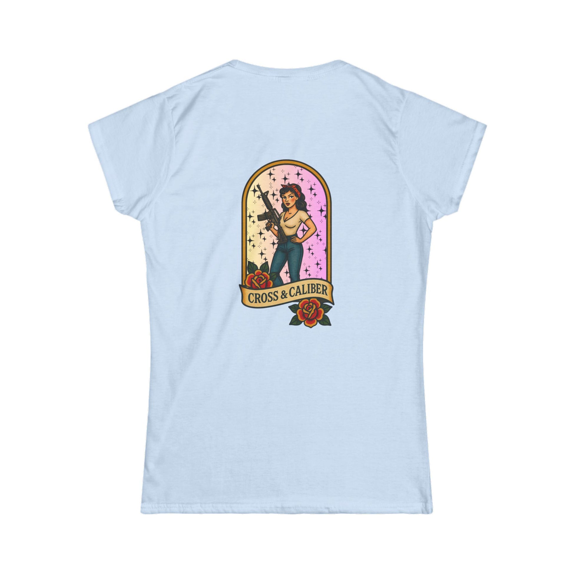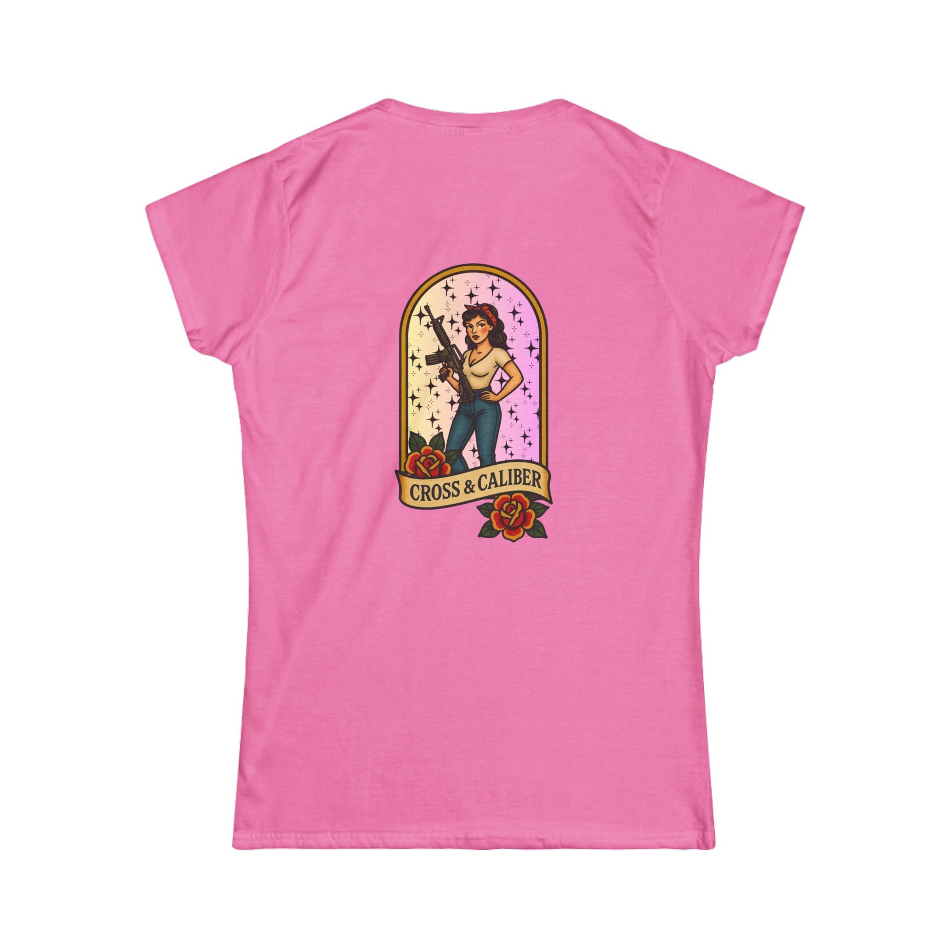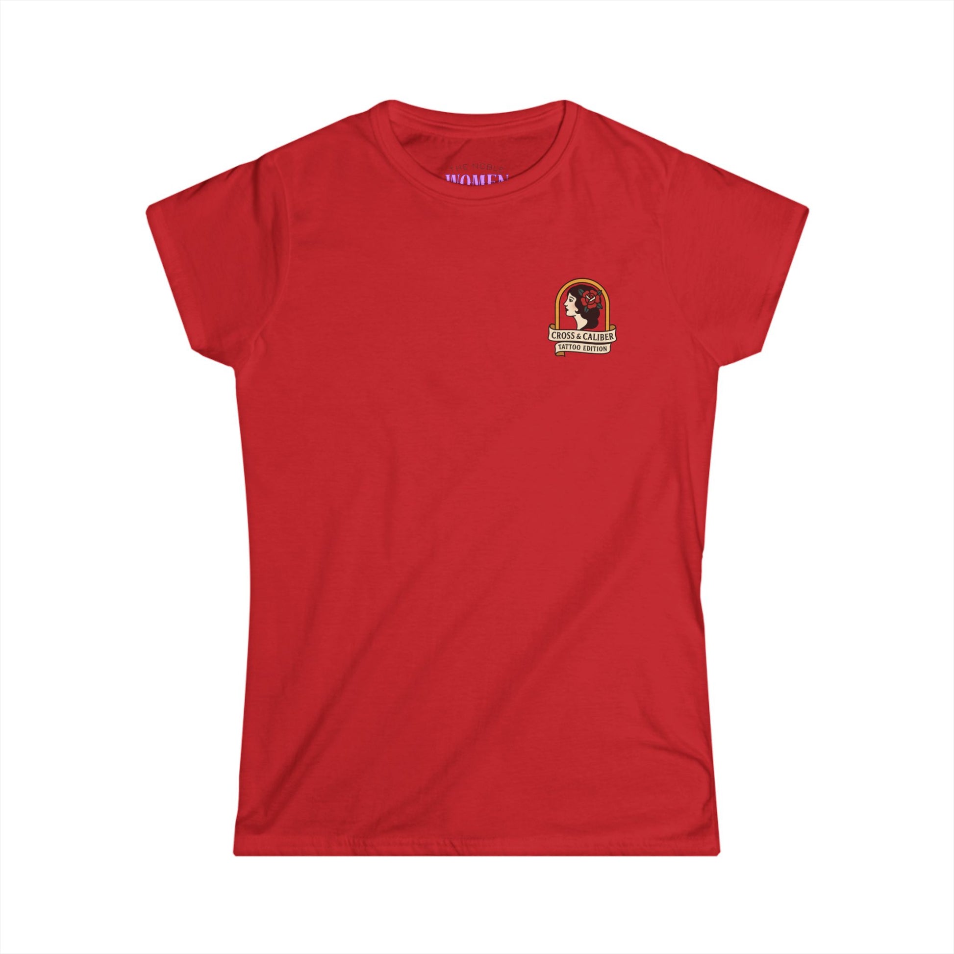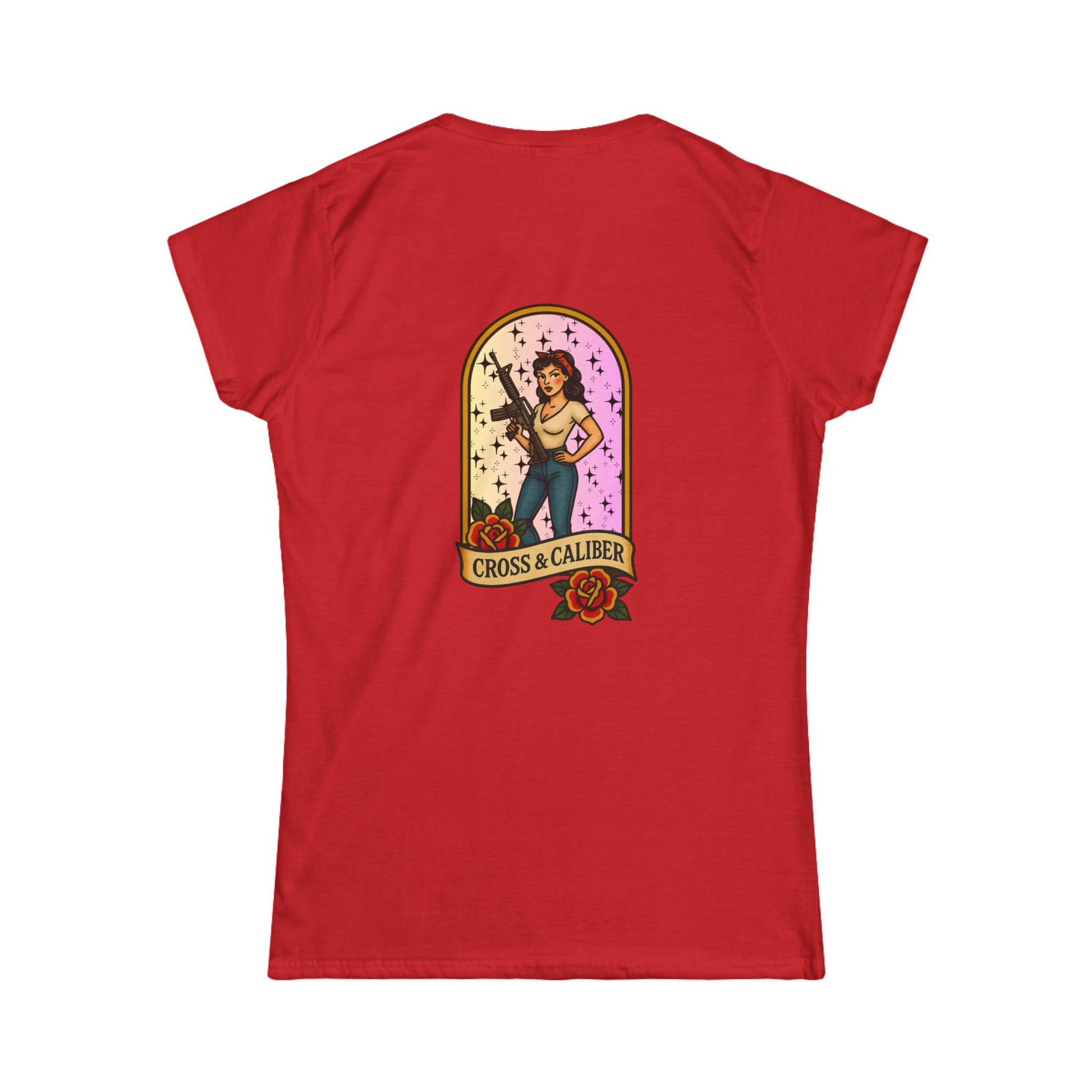 Vintage-Inspired Women's Softstyle Tee with Front Patch and Back Design